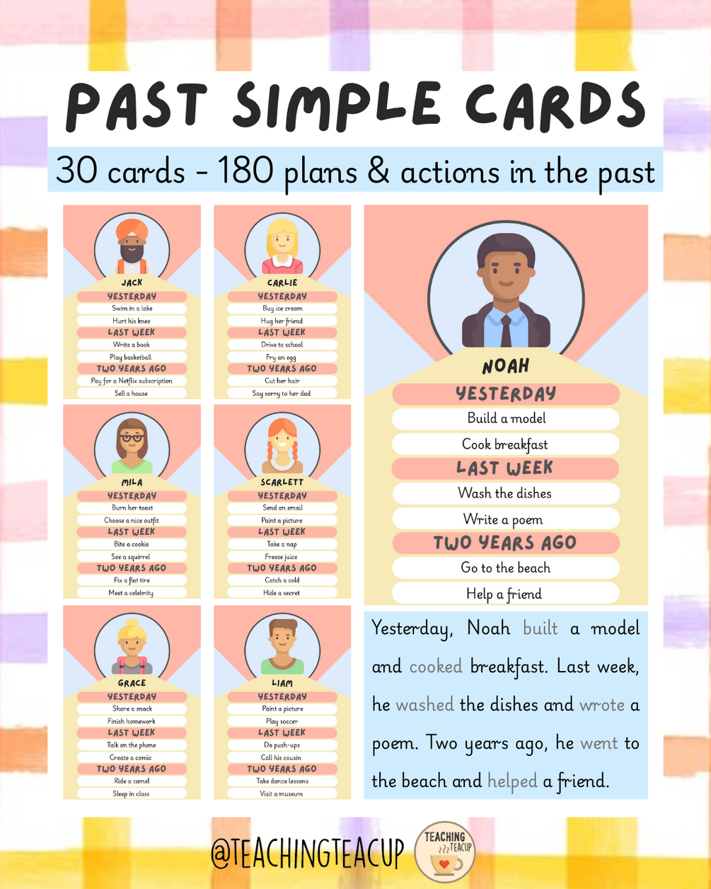 Si no quieres imprimir las tarjetas, proyéctalas. Deja un tiempo prudencial para que es puedan escribir las acciones en pasado en sus cuadernos. También puedes hacerlo de manera oral.